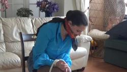 In white blouse and kilt, Pixiee lets herself be tied to the bedpost